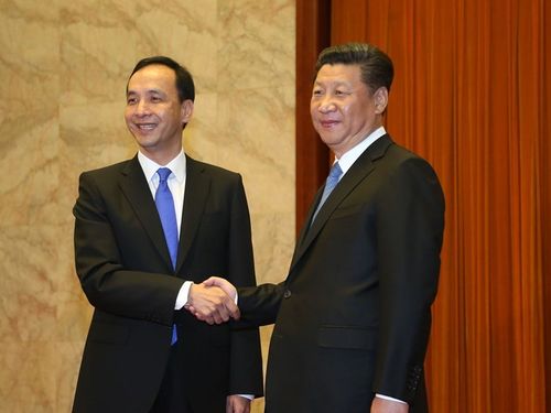 | 習近平氏(右)と握手する朱立倫氏=2015年、北京 |