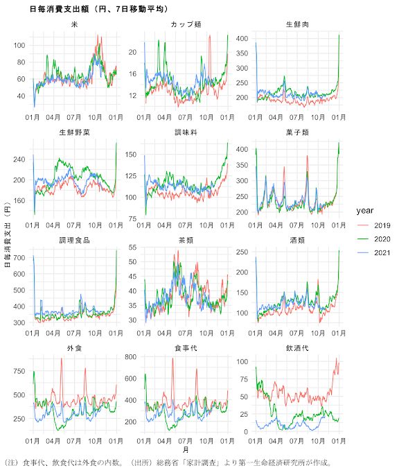 品目別にみると「食料」は前年同月比0.9%減でした。10月下旬まで飲食店の時短や酒類提供の制限が残っていたため外食が減りました。