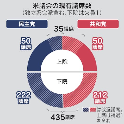 上院選で争う35議席のうち民主党の現有議席は14、共和党は21です。上院は両党の議席が50ずつで拮抗しており、民主党が1議席でも減らせばバイデン政権は法案や意中の人事案を通すのに共和党の協力が欠かせなくなります。中間選挙は政権与党に厳しい目が向けられ、大統領選で勝った政党が議席を減らす場合が多いです。オバマ元大統領の民主党は2010年、14年に上下院とも議席を減らしました。