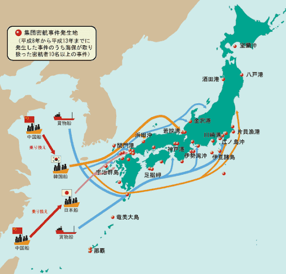 - 日本でも密航の問題があり、中国からの不法入国が増加している。特に「蛇頭」と呼ばれる密航組織が関与しているケースが多い。