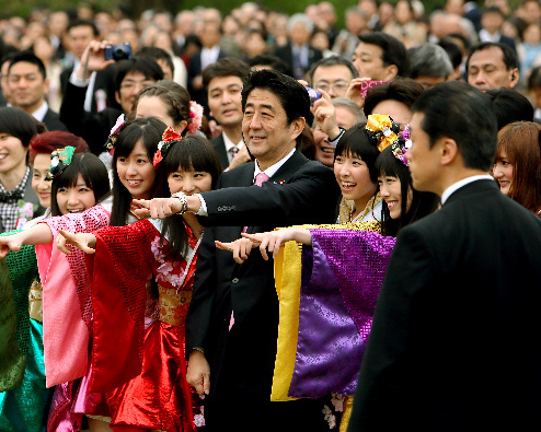 「桜を見る会」でももいろクローバーZのメンバーらと記念写真に納まる安倍晋三首相(中央) |