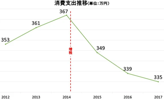 下の図は、世帯ごとの消費支出の推移です。2014年から、2017年の間に、各世帯の消費は年34万円も減ってしまっています。こはサラリーマンの月収、1カ月分に近いです。
